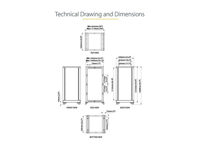 Specifikation Produktbeskrivning StarTech.com 25U-serverrack med öppen ram - 4 stolpar justerbart djup (59 cm till 104 cm) rack för nätverksutrustning med hjul/nivåfötter/kabelhantering (4POSTRACK25U) - rack - 25U Produkttyp Rack Racktyp Öppen ram Förpackningens innehåll Stjärnmejsel, 16 x M6-skruvar, 2 baskonsoler, 2 toppkonsoler, 48 x M8-bultar, 8 x hörnsektioner, 48 x M8-brickor, M8-nyckel (13 mm), 4 x hjul, 4 x utjämningsfötter, 16 x M6 flänsmuttrar, 32 x PVC-brickor, 32 x M6-hylsmuttrar, M6-nyckel (10 mm), 4 x mittsektioner, 2 x högervertikala skenor, 2 x vänstervertikala skenor, 4 x jordledningar, 16 x M6 platta brickor, 12 x hakmonteringsskruvar, 12 kabelhanteringskrokar, 32 x M6-krysskruvar Färg Svart Höjd (U-format) 25U Produktmaterial Stål Dimensioner (BxDxH) 60 cm x 66.18 cm x 121.9 cm Vikt 20 kg Egenskaper Inställningsbart djup, platt paket, 4 postrackmonteringsbara, 4 stänger Tillverkarens garanti 2 års garanti Designat för P/N: CABCAGENT62B, CABCAGENTS62, CABCAGENUT2B, CABCAGENUT6B, CABCAGENUTS2, CABCAGENUTSB, CABSCREWM52B, CABSCREWM5B, CABSCREWM62B, CABSCREWM6B, CABSCREWSB, CABSCREWSM5, CABSCREWSM5B, CABSCREWSM62, CABSCREWSM6B, CABSCRWS1224, CABSCRWSM62B -